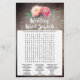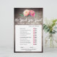 Dit roemrijke bloemenboeket "zei ze dat" quizspel is perfect voor een vrijgezellenfeest met een bloeiend landthema. Aan de voorkant van de spelkaart staat "hij zei dat ze zei", wat een leuke quiz is over de bruid en bruidegom. Op de achterkant van de kaart staat een woord met huwelijkswoorden en zinnen. Het ontwerp is voorzien van een elegante opstelling van wazige roze waterverf pinda's op een met hout getextureerde achtergrond. Pas de spelkaart aan met de bruidsnaam en de datum van de trouwdouche.