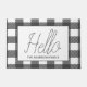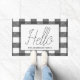 Robuust grijs en wit buffel controleer vlekkelvormig met het woord "Hallo" in dun manuscript. Deze mat kan gepersonaliseerd worden met de naam van je familie!