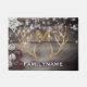 Landkreis, goudglitterhertengeweien hebben een gepersonaliseerd hormoon dat perfect is voor een kerstvakantie in het land - Robuuste, oude houten foto-achtergrondfoto met kerststerren op landstijl en rode en witte gordels aan de linkerkant. Persoonlijke familienaam onderaan in elegante letters. Monogram initiaal met een schaduweffect is gecentreerd boven een paar feestelijke, goudglitter buck hertengeweien. Robuuste, witte sneeuwvlokken zijn verspreid over de bovenste helft en hebben een versleten, gestempelde werking. Welkom op feestelijke feestdagen voor gasten voor een luie blokhut. Landskic, monogrammed wintervakantiehuisje, familiekerstcadeau, of unieke kerstcadeau voor de nieuwsleed voor de kerstbruiloft. Opmerking: Alle afbeeldingen zijn afgedrukt. Niet echt glitter of hout. Elegant decor voor de winterse feestdagen of voor hertenjagers of dierenvrienden. Sla je voorste veranda op met een gouden glittervakantie of een winterwoud dierenthema in het bos!