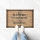De rotsachtige houten plankklep zegt "Welkom bij ons thuis" en is gepersonaliseerd met "NAAM" en het jaar dat is ingesteld. Een zwarte streep schetst de rand van de mat.