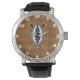 Dit horloge heeft een Afrikaans schild en gekruiste speren ontwerp op een gesimuleerde houten achtergrond met een tribaal patroon. Grote onderscheidende pols draag voor elke gelegenheid!