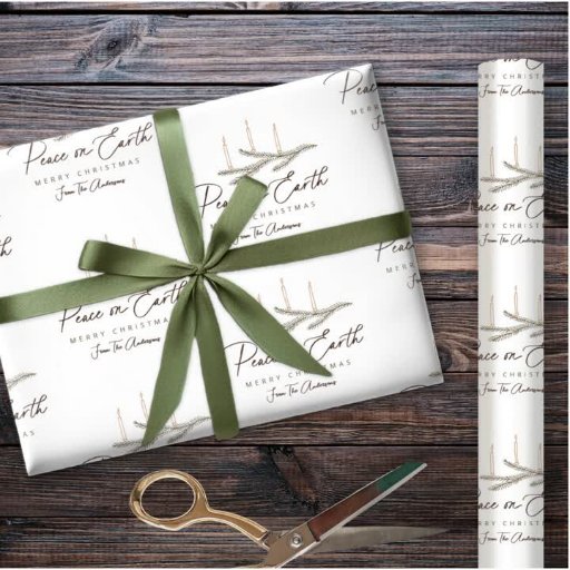 Peace on Earth Script Moderne minimalistische foto kerst Kaart. Je foto wordt bijgesneden in een grillig geschulpte lijst. Daarboven staat "Peace on Earth" in een elegant handgeschreven lettertype met een rustieke, met de hand getekende, groenblijvende tak met kaarsen. Onderaan de kaart staat je groet, familienaam en jaar. De achterkant van de kaart heeft een optie voor meer bewoordingen en de voornamen van uw familie. Alle kleuren zijn door u te bewerken. Kies kleuren die uw foto aanvullen voor die unieke look. © Kimbelished, LLC