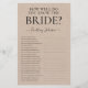 Dit mooie rustieke Hoe Goed Ken Je De Bruid? bruiloftsshower spelblad is eenvoudig en charmant - perfect voor elke shower. Dit leuke en makkelijke spel zal zeker veel gelach brengen naar elke bruiloftsshower. Geef gewoon een blad aan elke gast (vergeet de pennen niet) en laat de pret beginnen! Je zult verbaasd zijn hoeveel mensen eigenlijk sommige antwoorden weten.