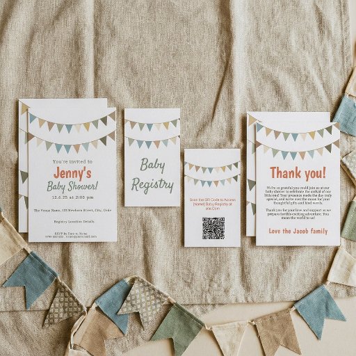 Maak het delen van uw baby-register moeiteloos en onvergetelijk met deze charmante inzetkaart, met vrolijke bunting in gedempte rustieke pastels aan de bovenkant. Ontworpen voor baby showers of aankondigingen, bevat elke kaart een handige QR-code die gasten rechtstreeks naar uw online register leidt zonder dat typen vereist is! De vriendelijke lay-out en het zachte, aardse palet stemmen prachtig samen met een reeks thema's, waardoor uw evenement zowel stijl als gemak krijgt. Een prachtige, moderne behuizing die gasten blij houdt en uw feest naadloos georganiseerd.