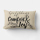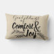 Rustiek vakantiekussen met de uitdrukking "Good Tidings of Comfort & Joy" in het zwart over beige.