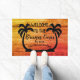 Tropisch strandhuis heet een slaapzool met een bijtende houten achtergrond en zwarte palmbomen silhouette.