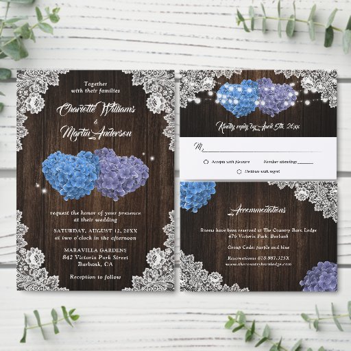 Romantic rustic paars and blue floral bruiloft bewaar de datumkaarten met hydrangea bloemen tegen een schuurhoutachtergrond, voorzien van witte florale en touwlichten. Overeenkomende objecten beschikbaar.