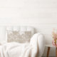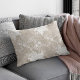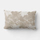 Rustische traditionele boerderij-stijl lumbar kussen op beige faux-puree met een mooie witte, transparante kant met een bloempatroon.
