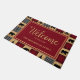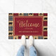 Robuuste "welkome" deurmat met een lappendeken van rode en zwarte buffels, wisselend met patches van een houten plankontwerp. Beren en pijnbomen worden in het patroon gemengd. Pas aan met "Welkom" en uw familienaam of een tekst die u kiest. Ideaal voor je berghuis.