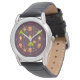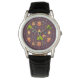 Een horloge met een leuk kampeerpatroon. Plaats op een roodbruine achtergrond. Elementen in het patroon zijn een kampvuur, een tent, een gitaar, een schop en rugzak.