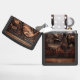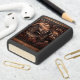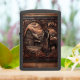 Een kunstwerk in reliëf van leer met een cowboy die met zijn paard voor een rustieke schuur staat, met een zonnehemel op de achtergrond.