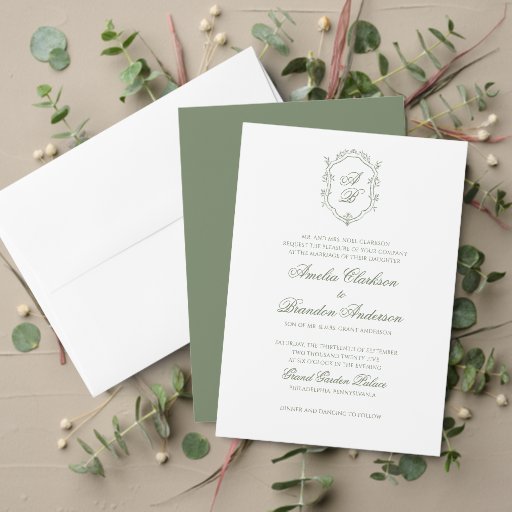 Deep Sage Green Botanical Monogram Crest WeddingOntworpen door Jessica Senarlo