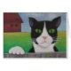Le chat de smoking scrute au-dessus de la barrière dans le pays avec une grange à l'arrière-plan.