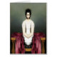 Een griezelig meisje met kort donker haar, grote, buggy ogen en geen mond, haar armen verschijnen als haar dwangbuis. Zittend in een groene kamer in een sanitarium, wordt een rode satijnen deken gedrapeerd rond haar beenloze romp. Originele digitale kunst van Taylor Addams.