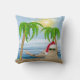 Schattigee Santa zandman op het strand met vakantieverlichting in palmbomen.
