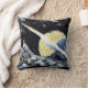 Een Saturnus-achtige planeet die in de donkere hemel boven het robuuste oppervlak van zijn satelliet stijgt. Een eenzame figuur die op een rots staat.