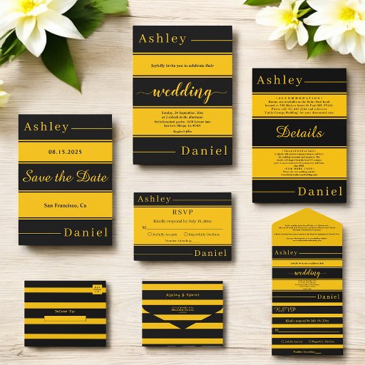 Ce mariage élégant noir et or, sauf la date, est parfait pour un mariage moderne. le design de luxe dispose de calligraphie noir et or sur un arrière - plan rayé noir et or.