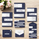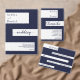 Ce mariage élégant bleu marine et blanc, sauf la carte de date, est parfait pour un mariage moderne. le design simple comprend élégante calligraphie bleue sur bandes blanches sur un arrière - plan bleu marine.