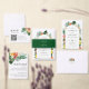 Un mariage élégant sauve la date dans le thème tropical d'été avec des feuilles de palmiers aquarelés peints à la main, des feuilles de banane, hibiscus, plumeria, et une belle photo du couple à l'arrière.
