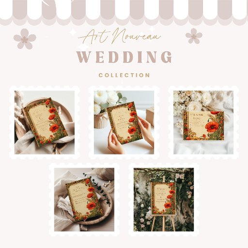 Faites une déclaration audacieuse avec ce design mariage Art Nouveau, avec des pavots rouges frappants encadrés de vignes dorées et des détails botaniques. L'illustration ornée allie élégance vintage et tons d'automne riches, créant un cadre romantique et dramatique pour votre célébration. Parfait pour les mariages rustiques, les cérémonies d'automne ou les couples qui aiment l'art floral intemporel. Customisez facilement avec vos propres détails pour une touche personnelle.
