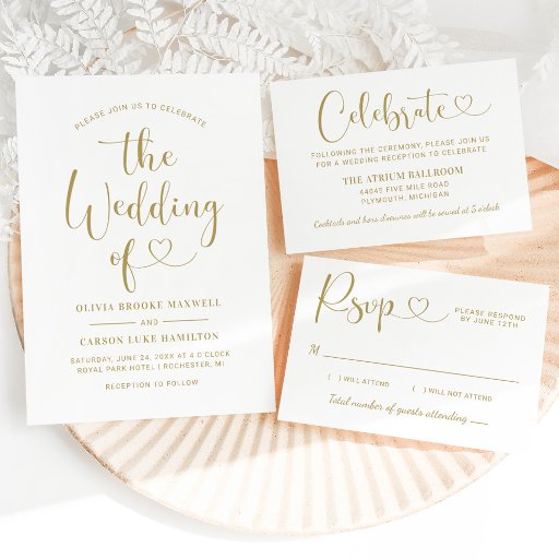 Les cartes de faire-part datées en or ancien et blanc sont dotées d'un collage de trois photos de fiançailles carré et d'un design de typographie élégant avec un script de calligraphie chic et un accent cardiaque. Le texte personnalisé simple et élégant qui peut être entièrement personnalisé avec la date mariage numérique, les noms de mariée et de mariée, lieu de cérémonie, site du mariage, et l'invitation formelle à suivre le libellé.