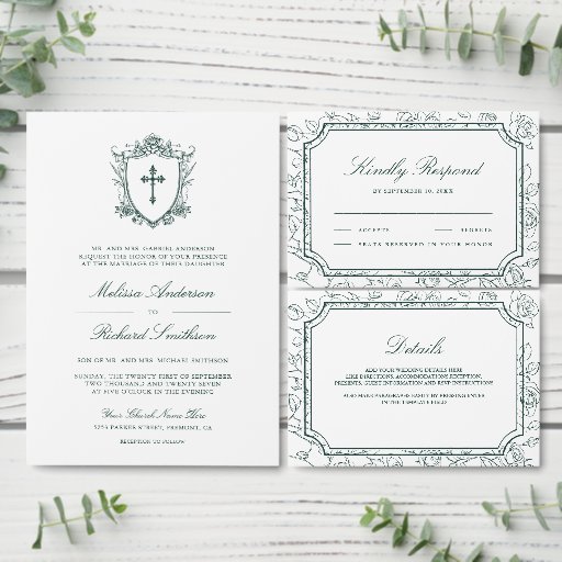 Save The Date Victorian White and Emerald Green Catholic Wedding