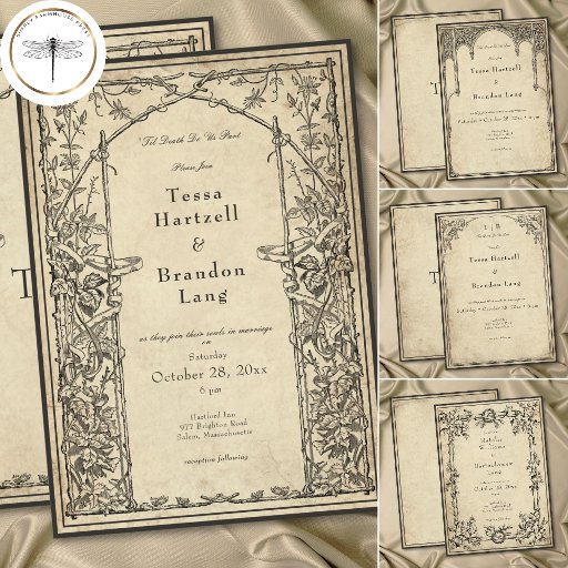 Elevate your gothic wedding with a medieval-inspired wedding invitation that exudes timeless elegance and mystery. Designed to replicate an antique vintage feel, this stunning design features delicate black line art gothic borders on a vintage, aged parchment background, evoking the charm of a bygone era. Let your love story unfold with an invitation as unforgettable as your day. Created by Simply Farmhouse Press.