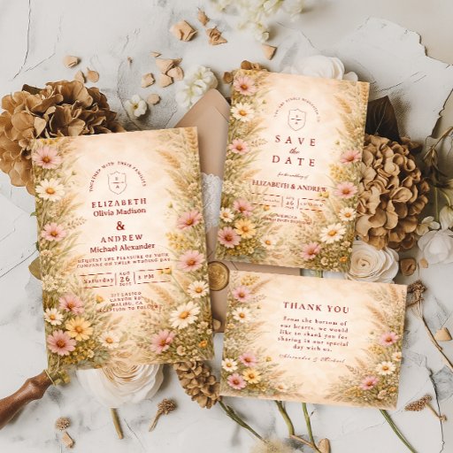 Inspired by lush autumn blooms and warm seasonal tones, this romantic wedding design features layered florals in shades of rust, blush, cream, and soft greenery. The painterly illustration creates a rich, elegant frame that feels timeless and inviting, perfect for celebrating love in the fall season.