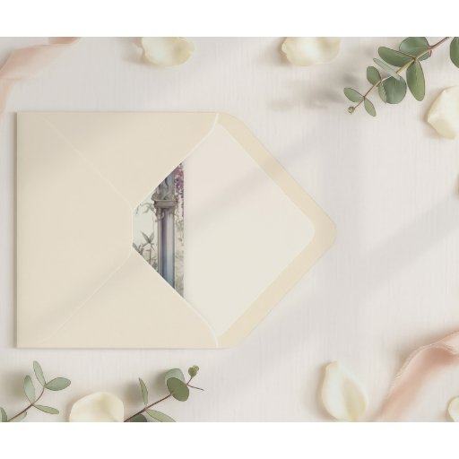 An elegant botanical wedding design featuring cascading lavender wisteria, soft greenery, and a romantic stone archway. The muted watercolor palette and refined florals create a timeless, garden-inspired look that feels both classic and ethereal—perfect for spring, summer, or outdoor weddings with a romantic aesthetic.