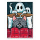 Cat Halloween wenskaart met een illustratie van een bange kat die zijn ogen bedekt met zijn poten terwijl hij in bed ligt. Achter het bed zitten twee spoken. Ideaal voor kattenliefhebbers! Copyright kunstwerk © Lisa Marie Robinson. Alle rechten voorbehouden.