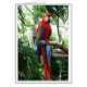 Een sjalot ara tegen een achtergrond van grote groene boombladeren. Ook gekend als de Rode en Gele Macaw, zijn deze luide grote rode vogels erg om naar te kijken! Geweldig fotografisch ontwerp voor elke papegaai, vogel of ara fan!