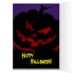 Erg eng uitziende pompoen met een uil in een boom hierboven. Een huidskleur met een diepblauwe nachtelijke achtergrond. Heel leuk en eng ontwerp voor je Halloween wenskaart.