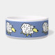 Het ontwerp van de cartoon van vun schapen herhaalde zich rond deze voedselbak voor gezelschapsdieren. Ideaal voor honden, vooral voor herdershonden. Blauwe achtergrond.