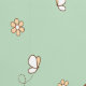 Steek kleine cartoon vossen met grote oren en staarten omringd door bloemen en flapende vlinders.