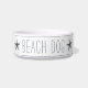 Cute coastal stijl hondenkom voor uw strandhuis of eilandverblijf met de woorden "strandhond" in rokerige havenblauwe boerderijstijl lettertype op een witte achtergrond, geaccentueerd met smalle marineblauwe strepen en een paar zeesterren.