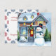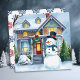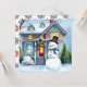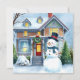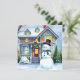 Gepersonaliseerde kerstkaart. Een schattige waterverf illustratie van een sneeuwpop voor een voorstedelijk Victoriaans huis in een lieve gezellige buurt. Sneeuwman heeft een blauwe sjaal en een hoge hoed op.