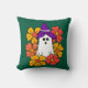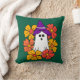 Leuk Halloween-ontwerp met een geest die een heks pet draagt, omringd door een krans van oranje en gele bloemen