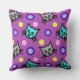 Een 20" x 20" werpkussen met een schattig, kleurrijk patroonontwerp van blauwgroen en grijze katten tegen een paarse violette achtergrond met veelkleurige polka dot accenten.