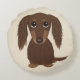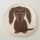 Een schattige langharige chocolade teckel puppy opzoeken. Het ronde kussen van deze schattige Doxie-liefhebber voegt een leuk decoratief accent toe aan je bank of bed. Een leuk cadeau voor iemand die van Wiener Dogs houdt. Bezoek Jenn's Doodle World voor meer huisdecoratie van het hondenliefhebber met deze weenie-hondentekening en veel meer originele hondenrassen cartoons.