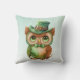 Een kussen met een prachtige grillige illustratie. Een grote ogige bruine uil met een fancy groene hoed en boog stropdas.