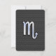 Een zilverchroom zoals Scorpio zodiac-symbool op een zwarte koolstof vezeltextuur drukdecor. Een modern ontwerp voor een moderne stadsmaterij voor een geweldig idee van een aangepast verjaardagscadeau. Gebruik de link "Vraag deze ontwerper" om contact met ons op te nemen met uw speciale ontwerpverzoeken of voor hulp bij uw aanpassingsbehoeften.