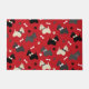 Cute black, gray and wheaten Scottie dogs wearing bows, with pawprints and dog bones on a red background.