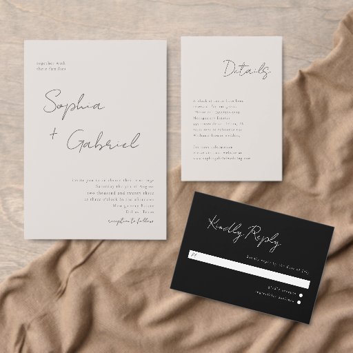 3,5 x 5 carte de réponse de script minimale. Texte blanc sur arrière - plan noir. Partie d'une collection mariage.