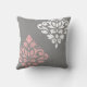 Scroll en bladdamast herhalingsontwerp in een poederroze en wit detail op een grijze achtergrond.
