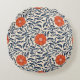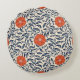 Seamless floral pattern with vibrant orange flowers and navy blue leaves on a beige background, creating an ornate, symmetrical design.