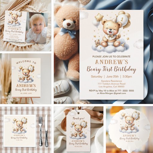 Celebrate your sweet little teddy bear's first birthday with our Teddy Bear-themed birthday boy design. The design features a cute teddy bear on clouds with brown and white balloons bearing the number 1. It also features cute, modern typography that can be personalized with your party theme. For complementary products, please check out the collection of this cute birthday design.