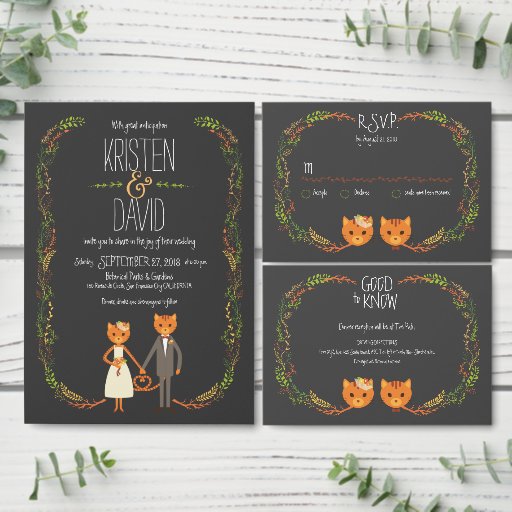 Cette charmante collection de faire-part de mariage est composée d'un couple de chats branchés et branchés, entourés d'une jolie guirlande de feuilles dessinés à la main dans un arrangement de gerbe.