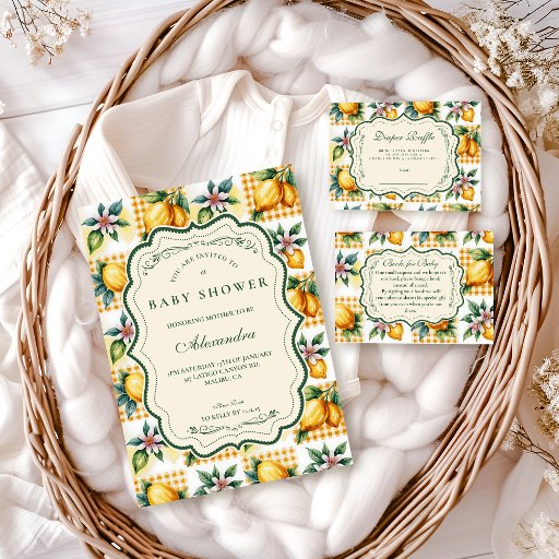 A fresh and cheerful baby shower design inspired by sunny citrus orchards. Bright lemons, delicate blossoms, and soft green leaves frame a classic scalloped centerpiece, creating a warm and inviting look. Perfect for spring and summer celebrations, this design blends natural charm with elegant typography for a timeless feel. A beautiful choice for honoring the mother-to-be in a vibrant, joyful setting.