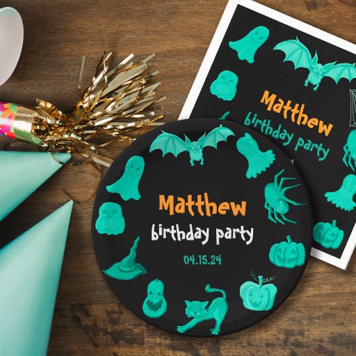 Serviettes de fête d'anniversaire vertes, oranges et noires avec motifs d'Halloween illustrés. Customisez le nom, la date et le texte que vous désirez.