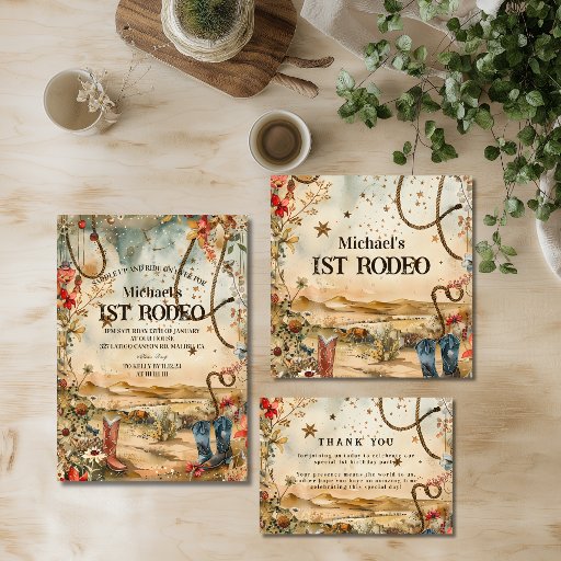 Celebrate your little cowboy’s first rodeo with this rustic western design! Featuring cowboy boots, hats, cacti, and red wildflowers, it sets the perfect scene for a country-style birthday party. Ideal for barn, farm, or outdoor celebrations with a vintage western touch.